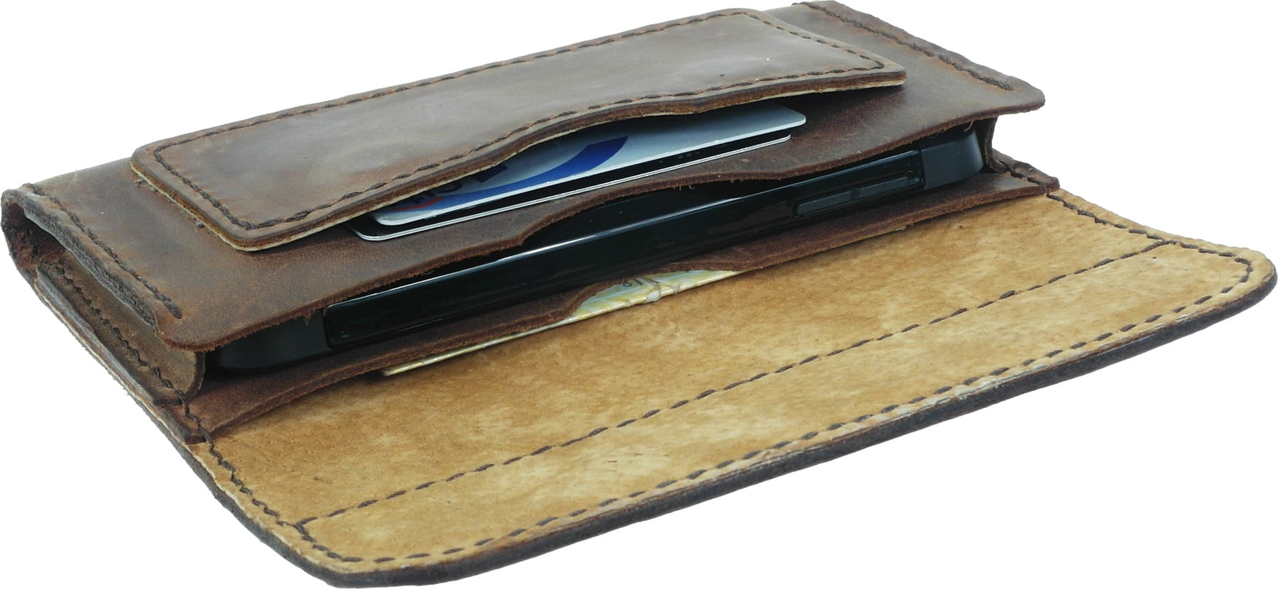 Pokrowiec na telefon z kieszonką na karty oraz wewnętrzną kieszenią na dokumenty i banknoty, wyprodukowany w Polsce z najwyższej jakości naturalnej skóry bydlęcej