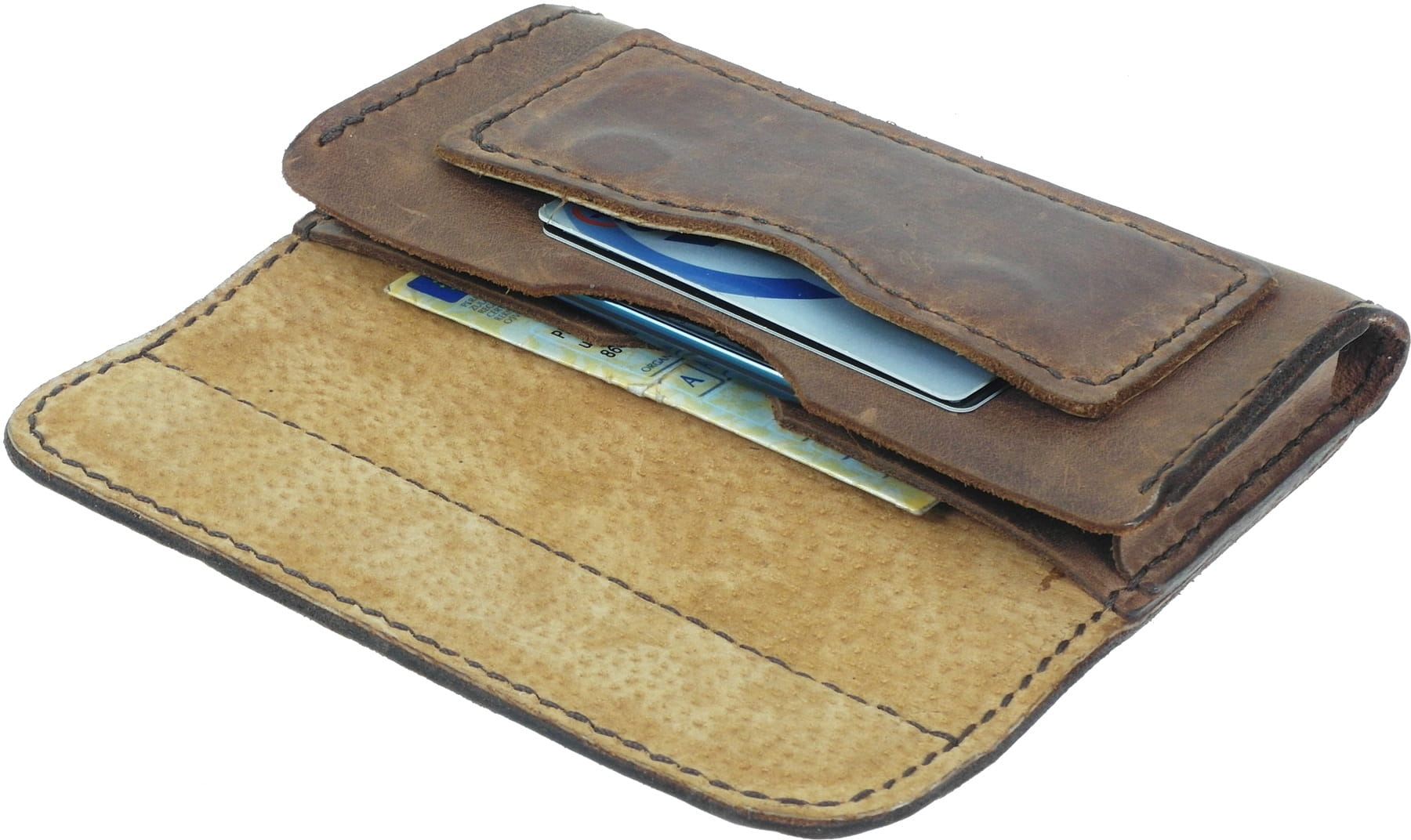 Pokrowiec na telefon z kieszonką na karty oraz wewnętrzną kieszenią na dokumenty i banknoty, wyprodukowany w Polsce z najwyższej jakości naturalnej skóry bydlęcej