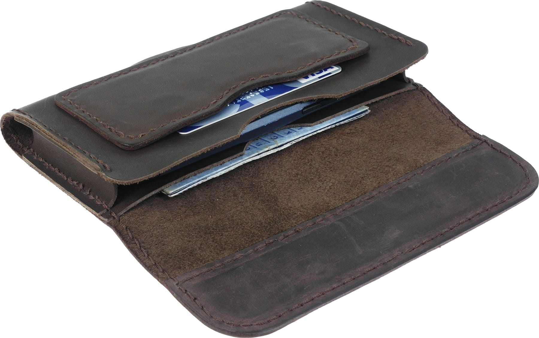 Pokrowiec na telefon z kieszonką na karty oraz wewnętrzną kieszenią na dokumenty i banknoty, wyprodukowany w Polsce z najwyższej jakości naturalnej skóry bydlęcej