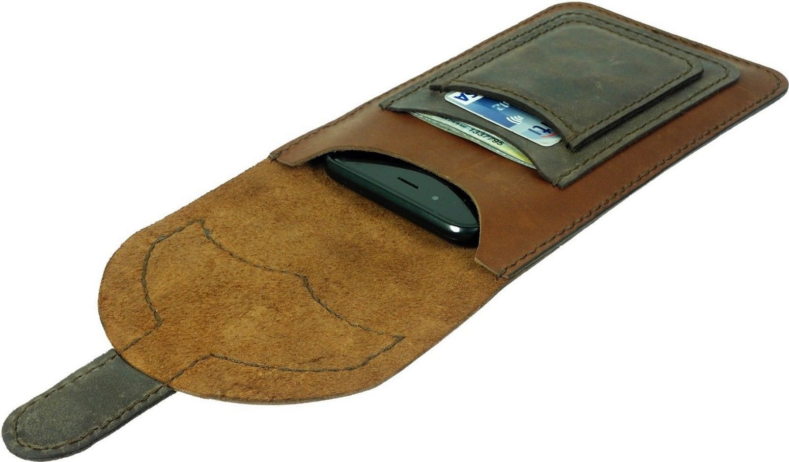 Ręcznie szyta kabura do telefonów z 2 kieszonkami na karty i dokumenty lub banknoty, wyprodukowana w Polsce z najwyższej jakości naturalnej skóry bydlęcej