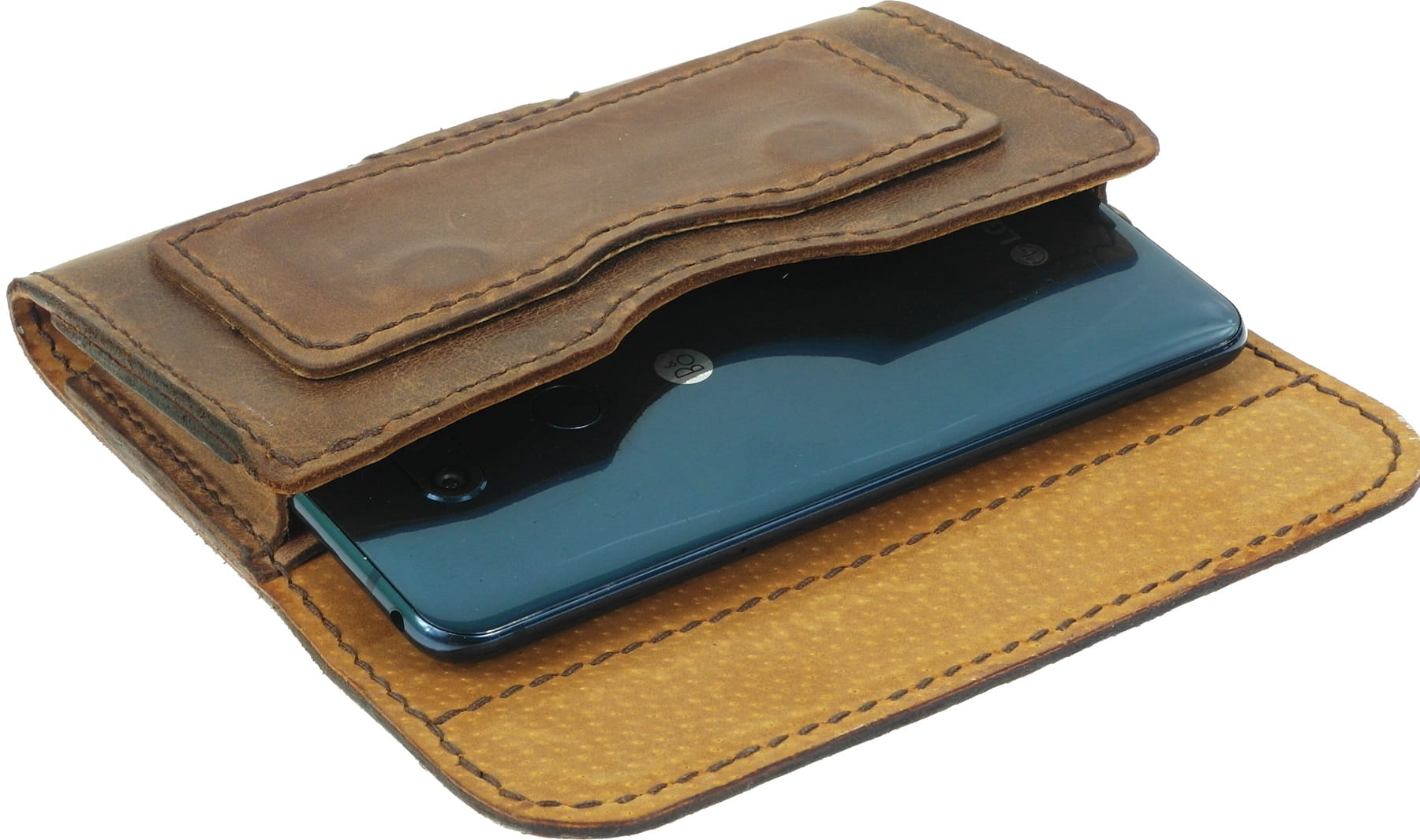 Skórzany pokrowiec na telefon jest wykonany całkowicie ręcznie.