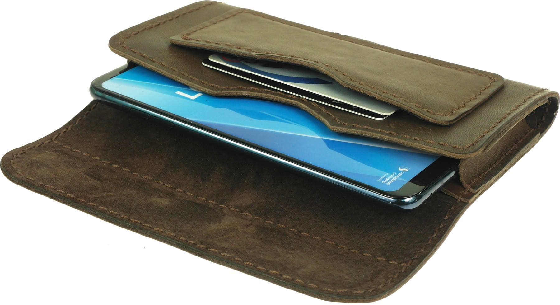 Pokrowiec na telefon z kieszonką na karty oraz wewnętrzną kieszenią na dokumenty i banknoty, wyprodukowany w Polsce z najwyższej jakości naturalnej skóry bydlęcej
