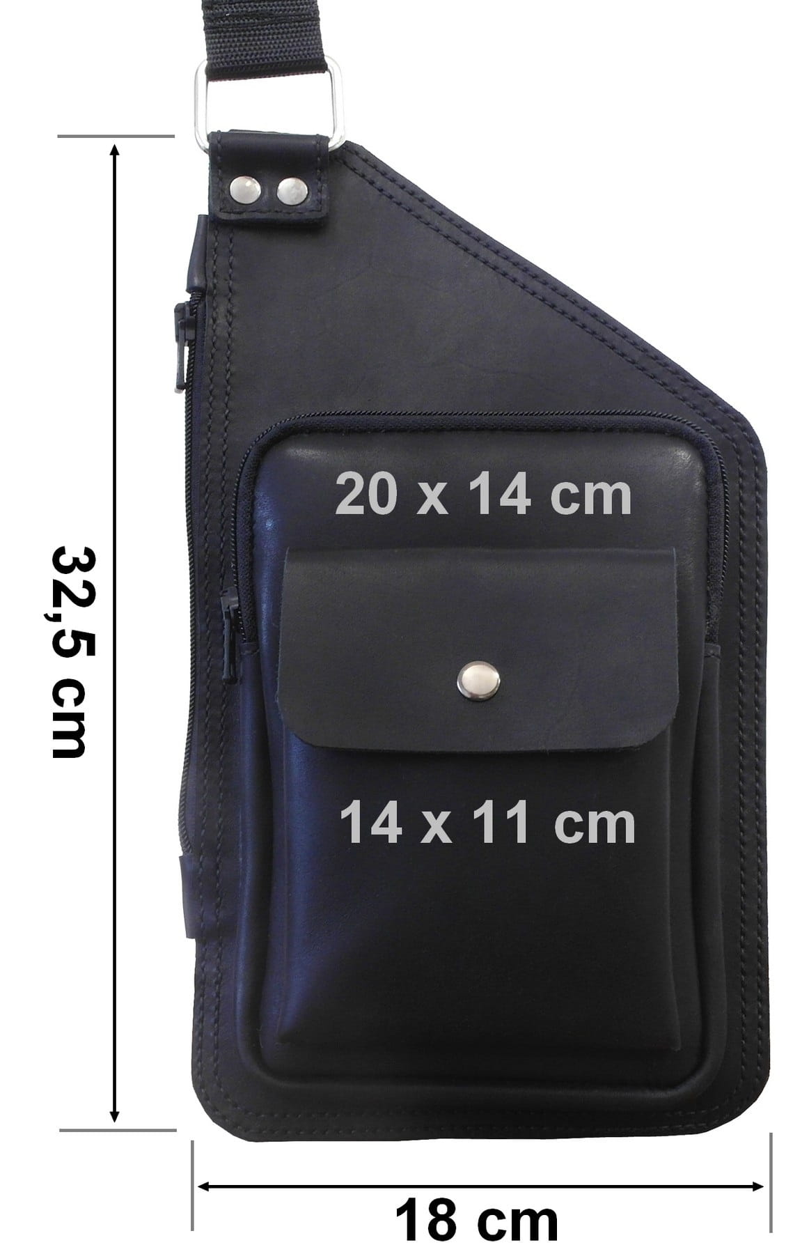 Całkowita wysokość tej skórzanej saszetki to 32,5 cm a szerokość 18 cm. Wewnętrzna komora z bocznym dostępem zamykanym na zamek błyskawiczny. Na przodzie naszyte dwie kieszenie, większa zamykana na zamek błyskawiczny o wymiarach 20x 14 cm, na niej kolejna mniejsza zamykana na zatrzask o wymiarach 14 x 11 cm