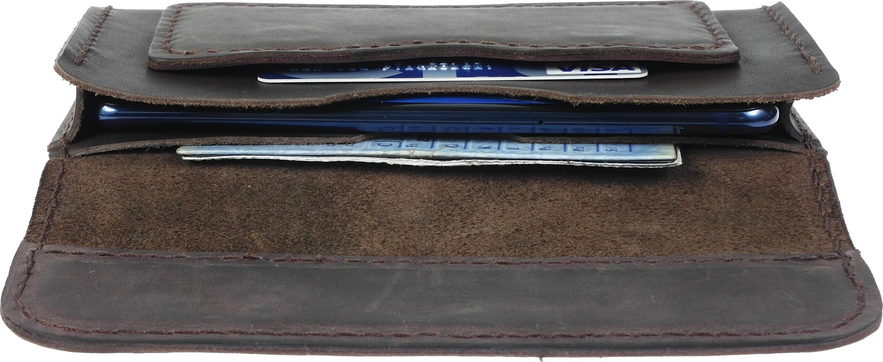 Ręcznie szyta skórzana kabura - pokrowiec do telefonu z kieszonką na karty oraz wewnętrzną kieszenią na dokumenty i banknoty, wyprodukowany w Polsce z najwyższej jakości naturalnej skóry bydlęcej