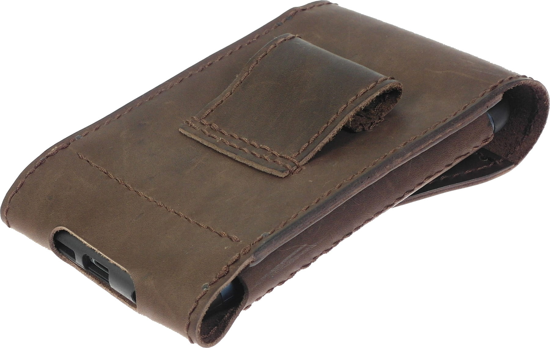 Ręcznie szyta kabura do telefonu z dodatkowym etui ochronnym. Wyposażona w 2 kieszonki, zewnętrzna na karty oraz wewnętrzna na dokumenty lub banknoty. Wyprodukowana w Polsce z najwyższej jakości naturalnej skóry bydlęcej