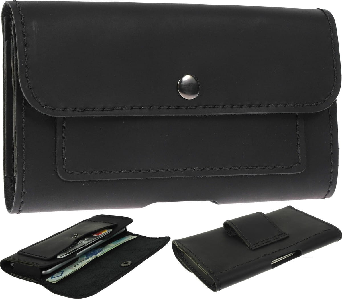 Ręcznie szyta kabura do telefonu z kieszonką na karty oraz wewnętrzną kieszenią na dokumenty i banknoty, wyprodukowana w Polsce z najwyższej jakości naturalnej skóry bydlęcej.