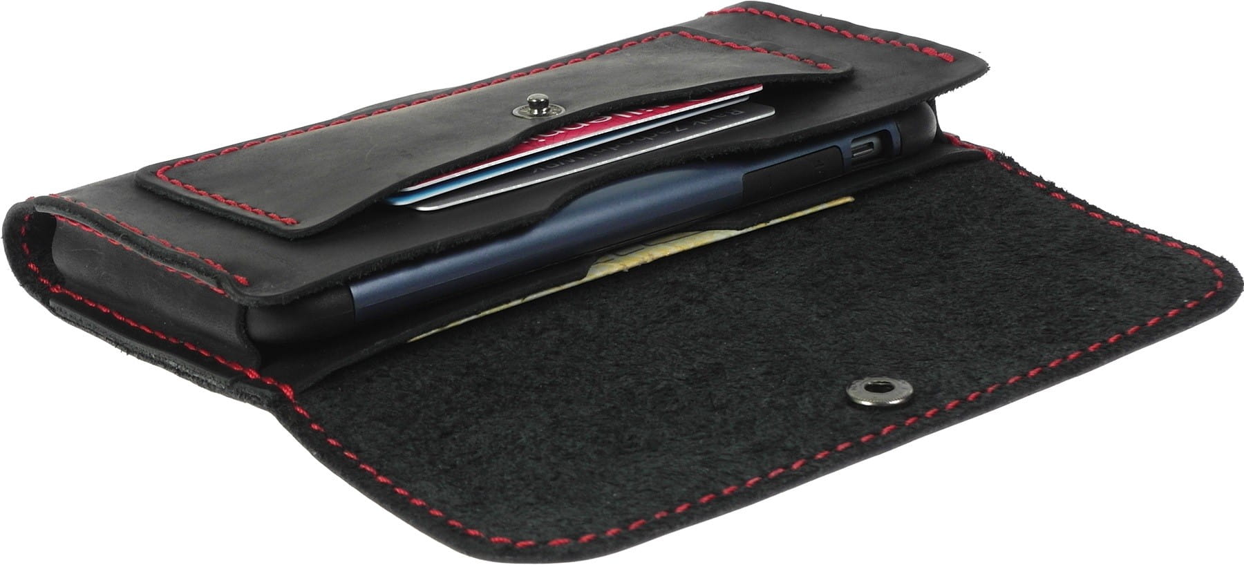 Ręcznie szyta skórzana kabura do telefonu z kieszonką na karty oraz wewnętrzną kieszenią na dokumenty i banknoty, wyprodukowana w Polsce z najwyższej jakości naturalnej skóry bydlęcej